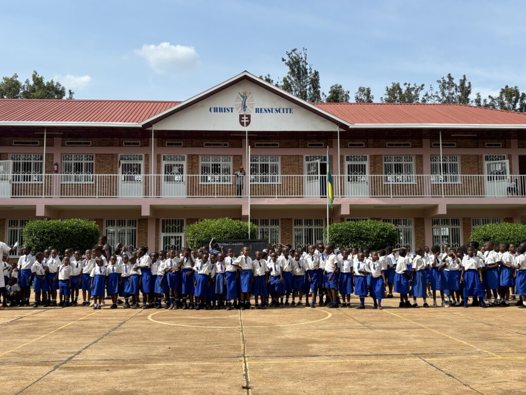 Representing New Hall on the visit to Rwanda were Mrs Katherine Jeffrey, Principal, and Mr Regan Schreiber, Head of Chaplaincy, accompanied by Old Fishes (alumni) Rebecca Jeffrey (2018–2020) and Gregor Petrikovič (2012–2014). Together, they visited all eight Mission Houses and spent time with pupils and teachers at École Christ Ressuscité. Students and staff at New Hall school had held a cake sale, which raised the £400 needed for sports equipment, for basketball, football and volleyball. Further donations from New Hall included sports kits, school uniforms, crucifixes, rosary beads, and teaching materials, as well as a £3,000 donation for the Priory.