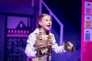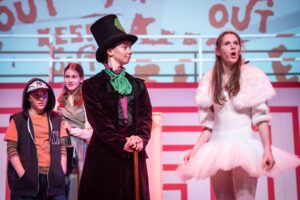 As Willy Wonka, Year 13 student Rosa Lawrence was masterful, delivering a thoughtful, slightly other-worldly performance that was captivating. Year 7’s Sylvia Bennett, appearing in her first Roedean production as Charlie Bucket, was outstanding. She combined assured acting with confident vocals and a winsome charm perfectly suited to Dahl’s gentle hero. Meanwhile, Lola Magee brought warmth and vocal strength to the role of Mrs Bucket, her excellent singing adding emotional depth to the family at the heart of the story, and Harrie Kavagnah nailed it as the breathless US TV reporter Cherry Sundae.