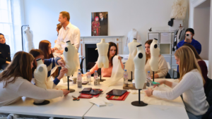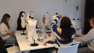 Students enjoyed an engaging introduction to the Academy’s values, creative ethos and industry‑focused degree pathways before embarking on a guided tour of the Mayfair campus. They met lecturers and spoke with undergraduates developing garments for their final collections, gaining an exciting insight into the creativity and technical skill required at degree level.