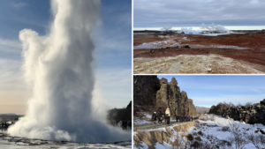 The famous Golden Circle route offered further geographical highlights, including the Kerið crater, the erupting geysers of the Haukadalur valley, the two‑tiered Gullfoss waterfall and the rift valley of Þingvellir National Park, where pupils stood between the Eurasian and North American tectonic plates.